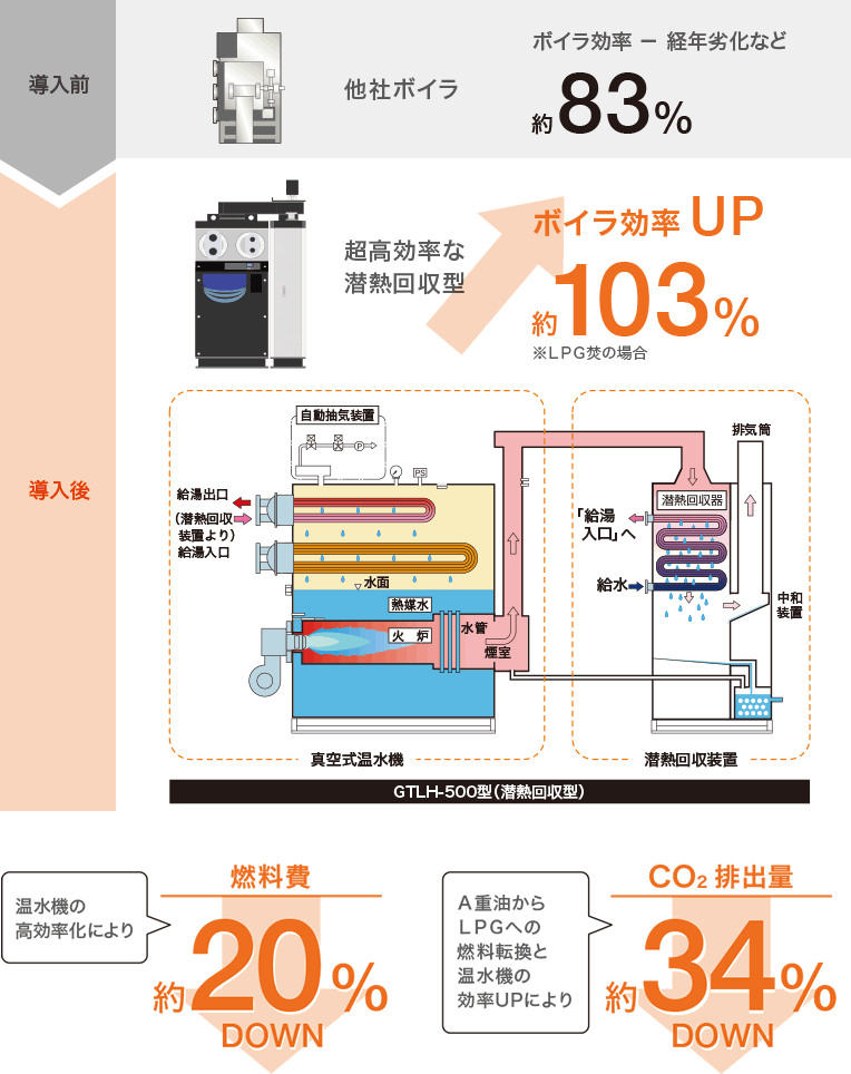 潜熱回収で熱効率を最大105%まで向上!