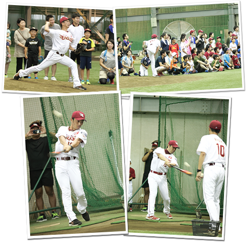 次は、鉄平コーチと後藤コーチのバッティングです。バットから快音を響かせ、遠くへ飛ばすそのスイングはさすがの一言。時折、天井ネットを揺らすほどの大きな当たりに、参加者からは拍手と歓声があがりました。