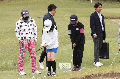 指導してくれるのは、星野プロと、星野プロと同じ東北福祉大学出身の野澤竜次プロ、そして3人のティーチングプロです。午前の部は初心者の子どもたち、そして午後の部は中・上級者が集まり、レッスンを受けました。