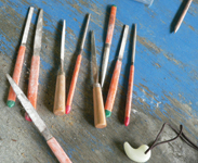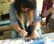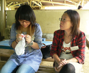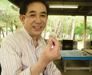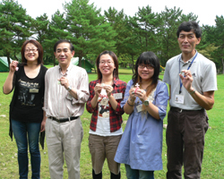 勾玉作り体験の舞台は、「奥松島縄文の村」。勾玉というと玉から尾が出たようなC字型の形を思い浮かべますが、ここではその基本形にこだわらず、自分の好きな形に仕上げてOK! 滑石という石を用いて世界にひとつだけのアクセサリーを作ります。下絵、穴開け、削り、着色と黙々と作業を重ねるみなさん、その姿は真剣そのものです。そんな中、気さくに冗談を言って場を和ませてくれたのが、財団法人亀井記念財団の事務長であり、今ツアーの企画立案者でもある阿部 功さん。留学生の良き相談役である阿部さんは、みなさんにとって日本のお父さんのような心強い存在のようです。さて、でき上がった勾玉はというと、ハート型あり十字架型あり。難しい形を自在に削り出し、そのできばえの見事さにインストラクターの佐々木正弘さんも舌を巻いておられました。