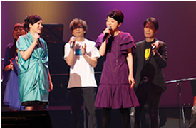 続いて、みやぎびっきの会のメンバーが登場。さとう宗幸さん、中村雅俊さん、稲垣潤一さん、小柴大造さん、遊佐未森さん、かの香織さん、山寺宏一さん、小川もこさん。宮城県ゆかりのアーティストがステージ上に勢揃いすると圧巻です。