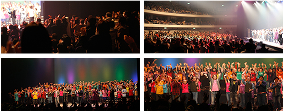 アンコールでは、参加した全員がステージにあがり、みやぎびっきの会・復興支援ソングの「虹を架けよう」を大合唱しました。いつしか会場は、総立ちとなり、「♪僕らを育てたこの街に 虹をかけよう〜」と各市町村の名前を歌い上げ、ふるさととそこに住むみんなへエールを送り、笑顔で感動のフィナーレを迎えました。