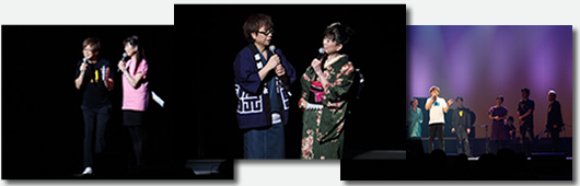 コンサートの実行委員長でもある稲垣潤一さんが「アーティストが、得意の歌を歌うだけのコンサートにはしたくない」とこだわっている演出。今回は、みんながもっと笑顔になって欲しいとみやぎびっきの会メンバー+サンドウィッチマンで、大喜利に挑戦。全員が和服に着替えて、勢揃い。珍回答続出に会場は、大爆笑です。