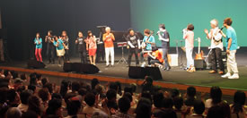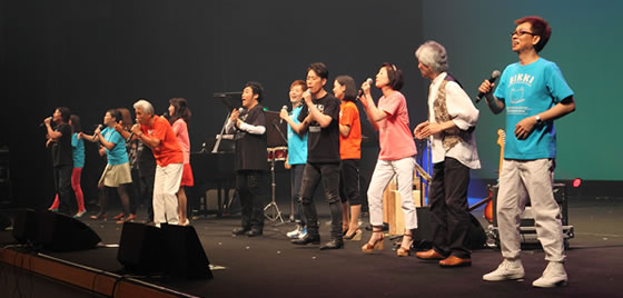 アンコールでは、全員びっきTシャツに着替え、復興支援ソング「虹を架けよう」を熱唱。「ぼくらを育てたこの街に、虹を架けよう」の部分は手話も交えての大合唱でした。