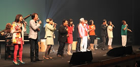 再び、山寺宏一さん、小柴大造さんのデュオで「はまべのうた」を歌ったところで、びっきファミリーの高橋佳生さんと庄子眞理子さんがステージに登場。高橋さんは被災地の方からリクエストが多かった「時代」を歌い、庄子さんは、子どものころこんな結婚に憧れていたという「あなた」を歌ってくれました。