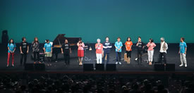 今回のオープニングアクトは、様々なコンクールで金賞や銀賞に輝いた実力派ブラスバンド、涌谷町立涌谷中学校吹奏楽部です。「復興への序曲〜夢の明日に〜」を演奏し、続いて軽快な「おどるポンポコリン」の演奏に合わせて、びっきの会メンバーのさとう宗幸さん、稲垣潤一さん、小柴大造さん、遊佐未森さん、かの香織さん、山寺宏一さん、小川もこさんが登場!会場は一気に盛り上がります。
