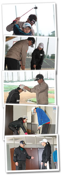 午後の部は、中級者から、全国レベルの東北高校ゴルフ部のメンバーまで、20名が参加しました。中級者以上ということもあって、練習はスイングとパッティングのレッスンに分かれます。星野プロは、ドライバー、アイアンのレッスンを、ほかのティーチングプロたちは、グループごとに交代で室内のパッドのレッスンを行います。