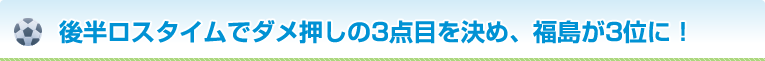 後半戦では、両チームともに円陣を組んで気合いを入れて臨みます。後半16分、ゴール前のもつれる中から福島の背番号4番松井蓮之選手が浮き球を決めてシュートを決め、同点に。福島が一気に勢いを取り戻します。後半40分、背番号6番の坪佳侑選手がセンターから上がってシュートを決めると、ロスタイムには背番号7番の宗方司選手がダメ押しの3点目。結果、3対1で福島県選抜が青森県選抜を下し、3位になりました。